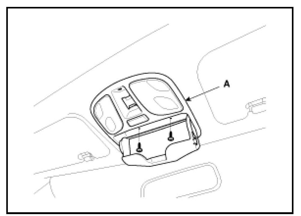 1. After loosening the mounting screws, carefully remove the overhead console lamp assembly (A).