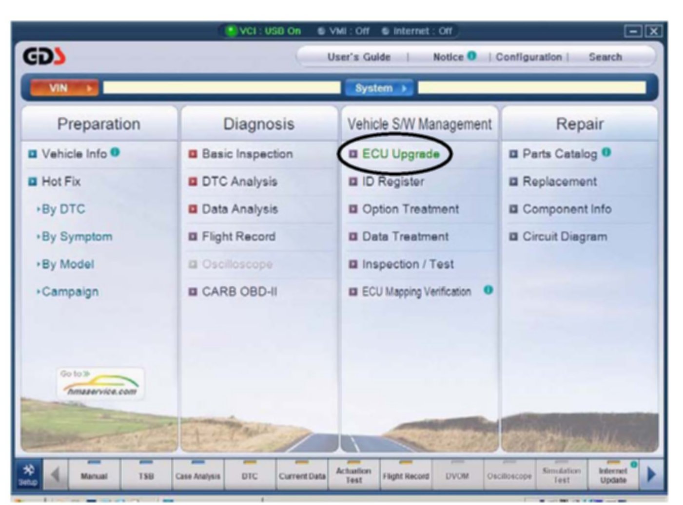 3.1 From the GDS home page, select ECU Upgrade. After selecting ECU Upgrade, if the GDS does not automatically detect the VIN, then manually enter the VIN number.