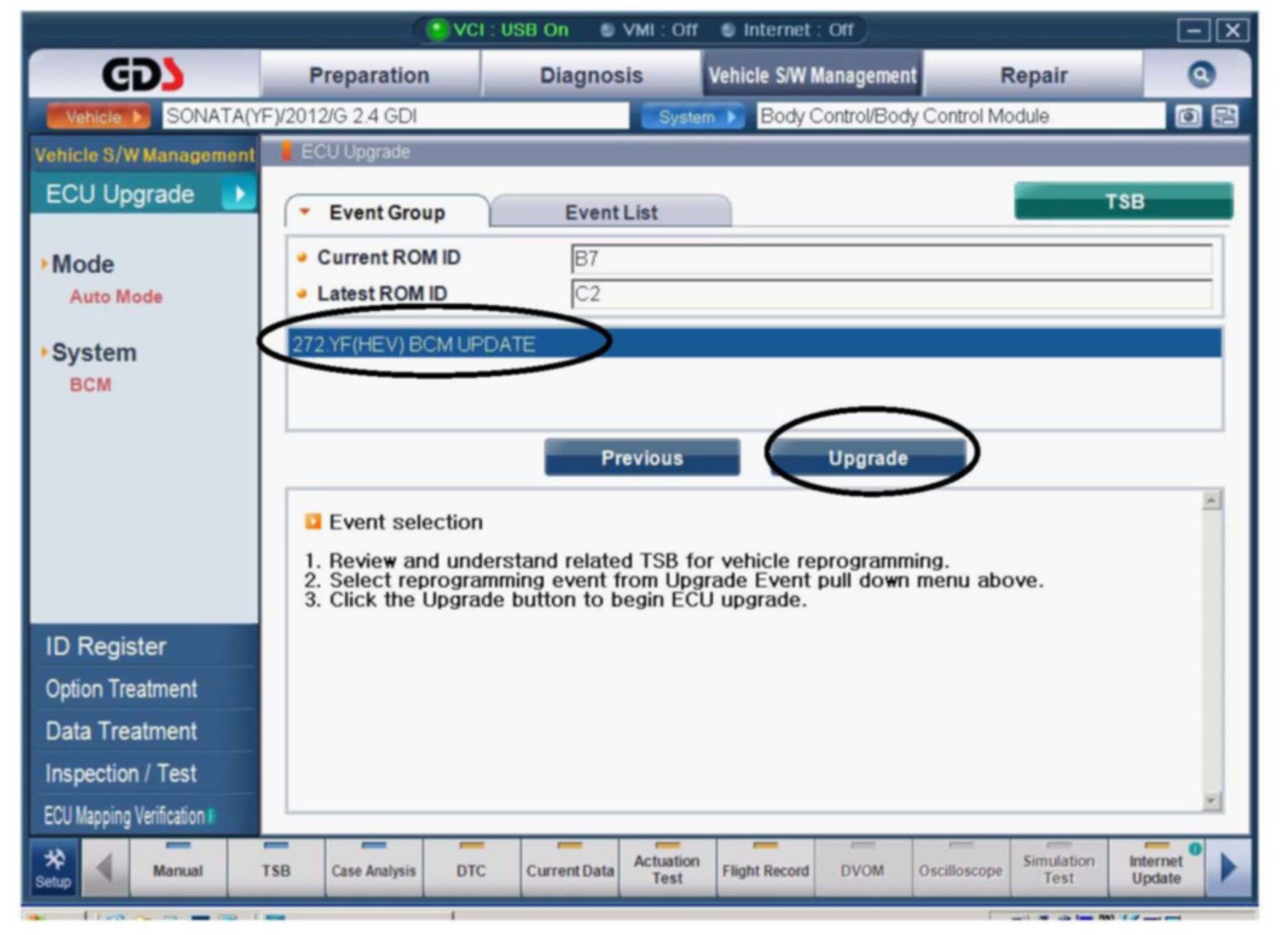 3.6 Select the reprogramming event "272 YF BCM UPDATE" and then select Upgrade.