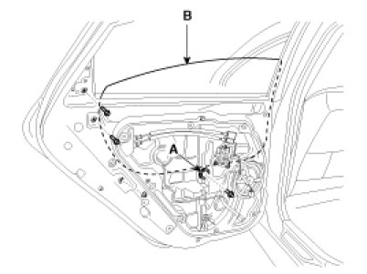 6. Carefully move the glass (B) until you can see the bolts, then loosen them. Separate the glass from the glass run and carefully pull the glass out through the window slot.