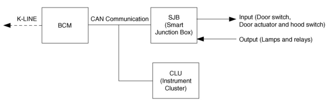 BCM, SJB(Smart Junction Box) and CLU(Instrument Cluster) are connected by CAN line.