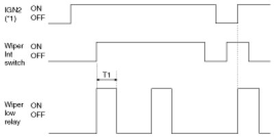 2. Under IGN2 switch ON, wiper LOW relay is turned ON after T2 from Washer switch ON if washer switch is ON for at least T1, and wiper LOW relay is turned OFF after T3 from the moment that Washer switch is turned OFF.