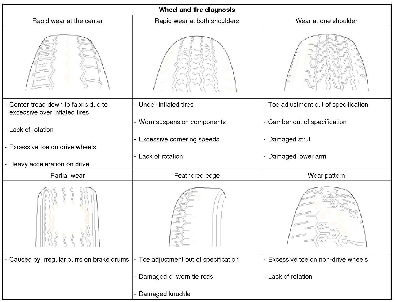 Careful attention must be paid to the tire and wheels. There are several symptoms that can be caused by damaged or worn tire and wheels. Perform a careful visual inspection of the tires and wheel assemblies. Spin the tires slowly and watch for signs of lateral or radial runout. Refer to the tire wear chart to determine the tire wear conditions and actions