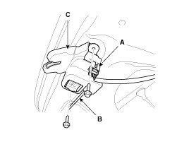 3. Disconnect the cable (B), then loosen the latch assembly (C) mounting bolts and remove.