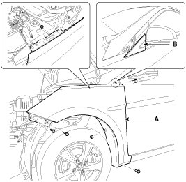 4. Using a screwdriver or remover, remove the fender side cover (B).