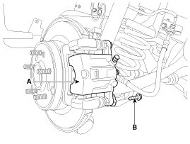 2. Loosen the guide rod bolt (B) and pivot the caliper (A) up out of the way.