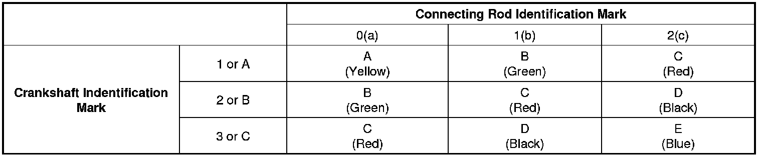 (9) If the plastigage measures too wide or too narrow, remove the upper half of the bearing, install a new, complete bearing with the same color mark (select the color as shown in the next column), and recheck the clearance.