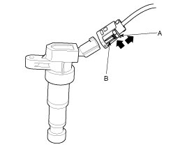 When disconnecting the ignition coil connector, pull out the locking pin (A) and then pull out the connector while pressing the clip (B).