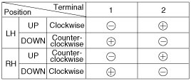 3. Connect the motor terminals directly to battery voltage (12V) and check that the motor operates smoothly. Next, reverse the polarity and check that the motor operates smoothly in the reverse direction. If the operation is abnormal, replace the motor.