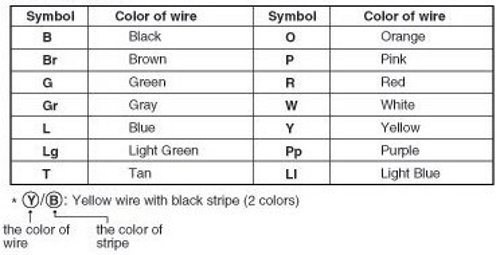 The following abbreviations are used to identify wire colors in the circuit schematics.