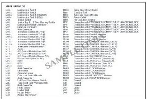 Electrical wiring connectors are classified according to the wiring parts in the Harness Layouts.