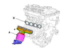Install the exhaust manifold (A) with the gasket (B).