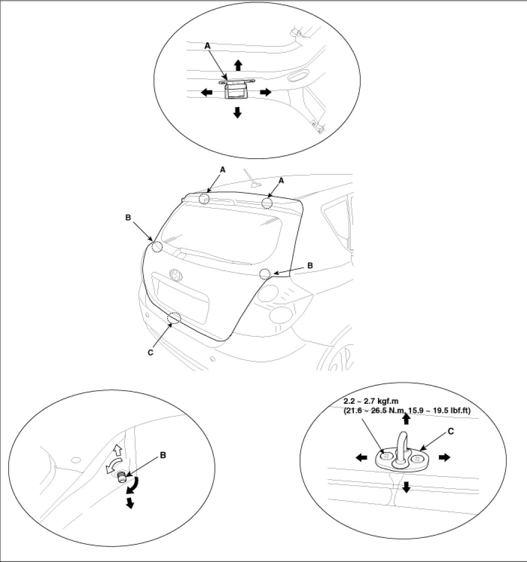 1. After loosening the tailgate hinge (A) mounting bolt,adjust the tailgate by moving it up or down, or right or left.