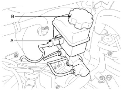2. Disconnect the brake fluid level switch connector (A), and remove the reservoir cap (B).