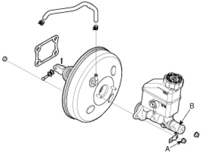 1. Install the master cylinder (B) to the brake booster.