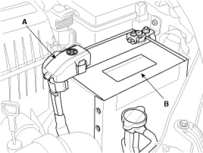 7. Install battery (B) and connect terminal (A).