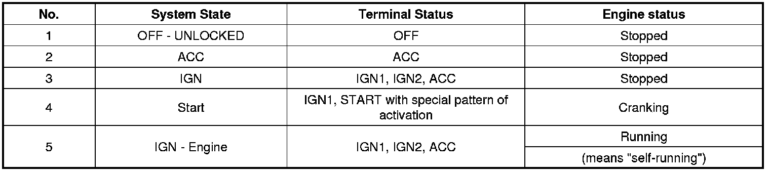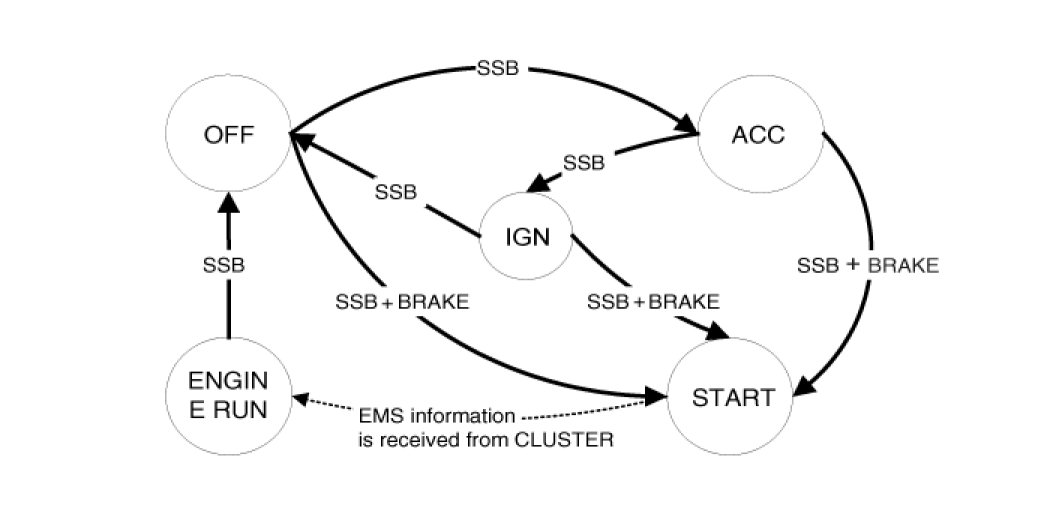 Referring to the terminals, the system states described in the table above are same as those one found in a system based on a mechanical ignition switch. The one of distinction with Mechanical-Ignition-Switch based system is that the BES system allows specific transition from [OFF] to [START] without going through [ACC] and [IGN] states.