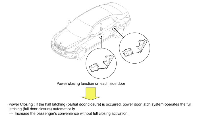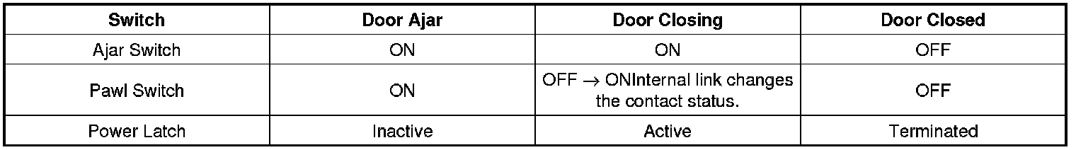 The power door latch feature must first determine if the door is completely shut or partially shut. This is accomplished by a switch located inside the latch (door lock actuator) and a body electrical switch.
