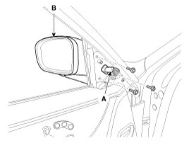 2. After disconnecting the connector (A), remove the outside rear view mirror (B).