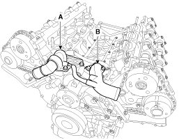 8. Install the RH timing chain guide (A) and the chain (B). Insert the guide to the fixing pipe of guide bolt with the chain.