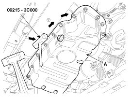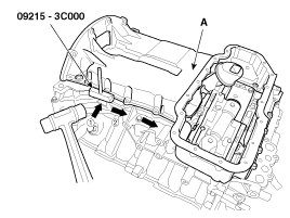 Insert the blade of SST(09215-3C000) between the upper oil pan and the lower oil pan. Cut off applied sealer and remove the lower oil pan.