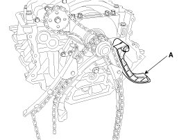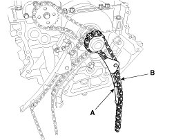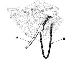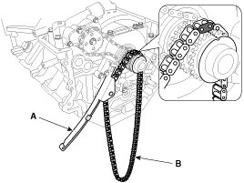 5. Install the LH timing chain guide (A) and the chain (B). Insert the guide to the fixing pipe of guide bolt with the chain.
