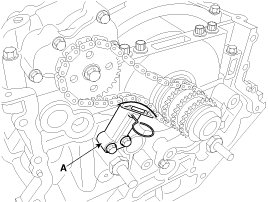 23. Insert a set pin after compressing the oil pump chain tensioner (A) and then remove the tensioner.