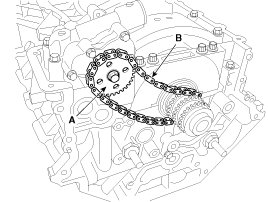 3. Install the oil pump chain (B) with the oil pump sprocket (A).