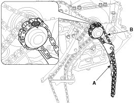 24. Remove the oil pump sprocket (A) and the chain (B).