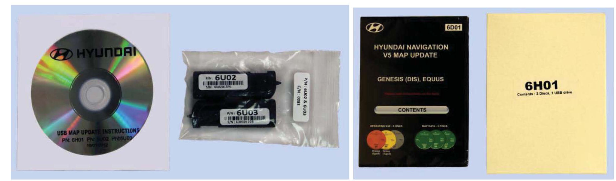 ^ 6 Disc DVD set (1 orange, 1 yellow, 1 grey, and 3 green discs) - Navigation Map and Operating System Update for Hyundai Genesis and Equus models equipped with the DIS Navigation System.