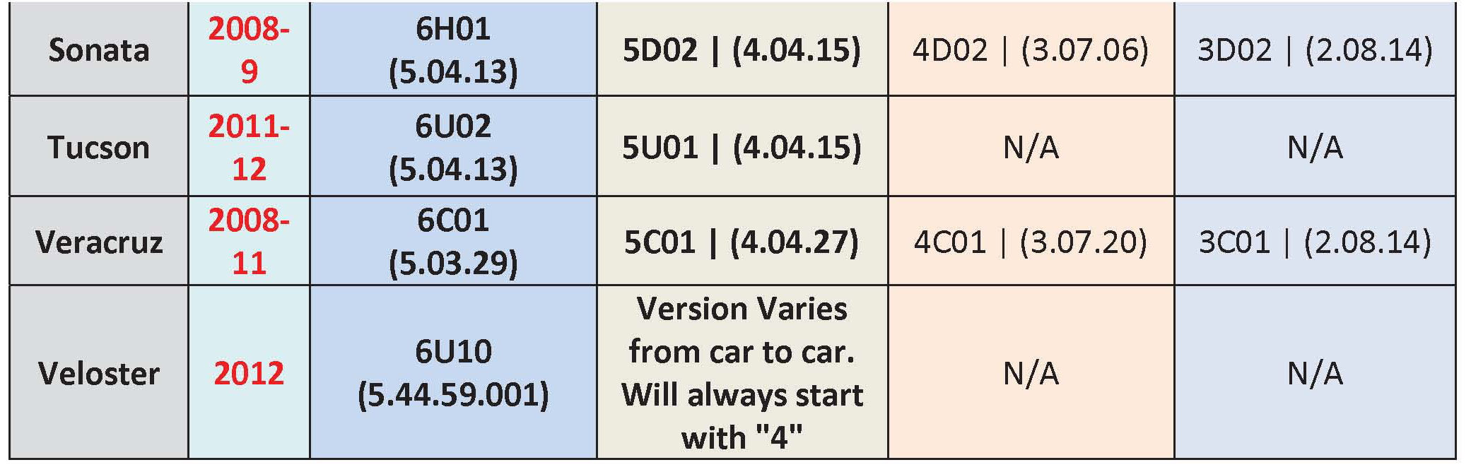 ^ Use the chart below to confirm the proper software before uploading into the vehicles navigation unit: