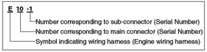 A Connector identification symbol consists of a wiring harness location classification symbol corresponding to a wiring harness location and number corresponding to the connector.