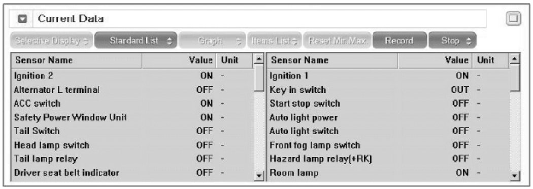 3. To consult the present input/out value of BCM, "Current DATA". It provides information of BCM input/output conditions of power supply, turn signal/brake lamp, headlamp, door, locks, outside mirror, wiper, auto-light and transmitters etc.