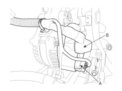 6. Disconnect the alternator connector (A) and cable (B) from the 'B' terminal.