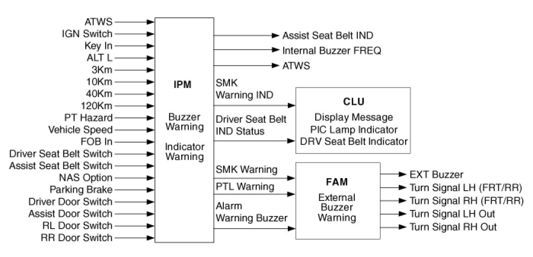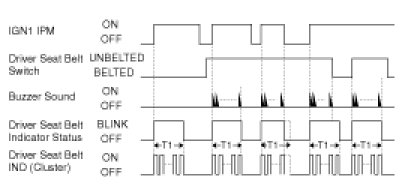 In case of Driver side 6sec Indicator, the cluster module operates it after receiving 'Driver Seat Belt Indicator Status' from the IPM. So if the IPM sends 'Driver Seat Belt Indicator Status = blinking' over 6sec then the IPM sounds buzzer warning one more time.