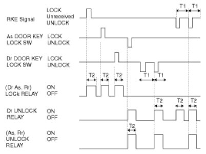 B. Driver door unlock signal is output for T2 when RKE UNLOCK signal is received. But, all door unlock signals are output for T2 if RKE UNLOCK signal is received within T1.