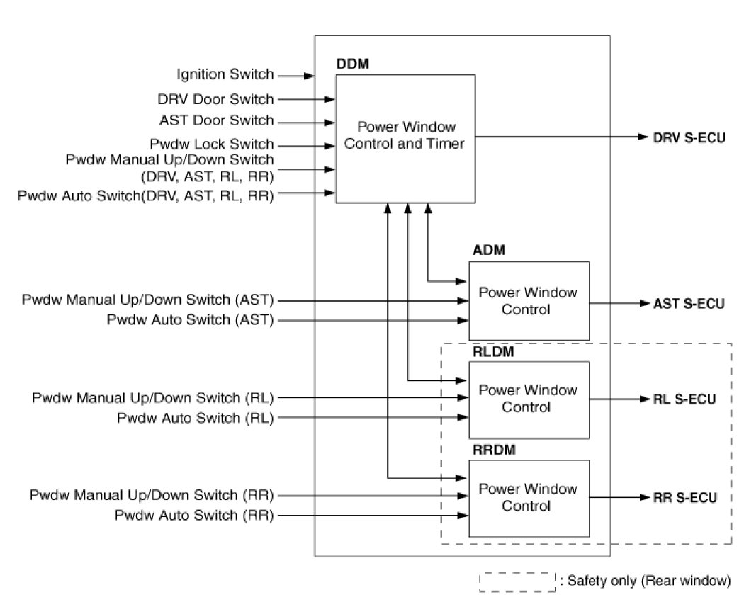 - Power Window Inhibition : ADM, RLDM and RRDM are inhibited by Power window Lock Switch