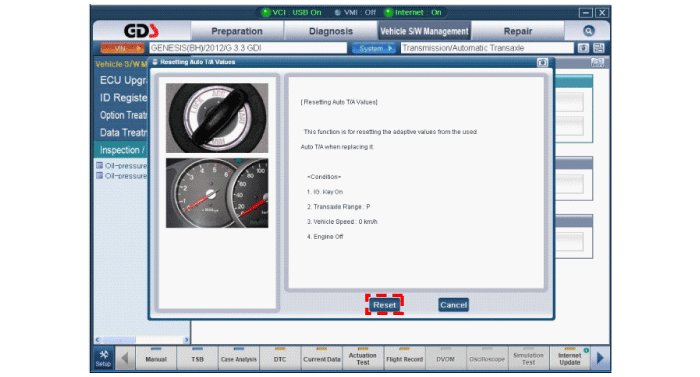 3. If problem is not found in Step 1 and 2, the TCM could be faulty. If so, make sure there were no DTC's before swapping the TCM with a new one, and then check the vehicle again. If DTC's were found, examine this first before swapping TCM.
