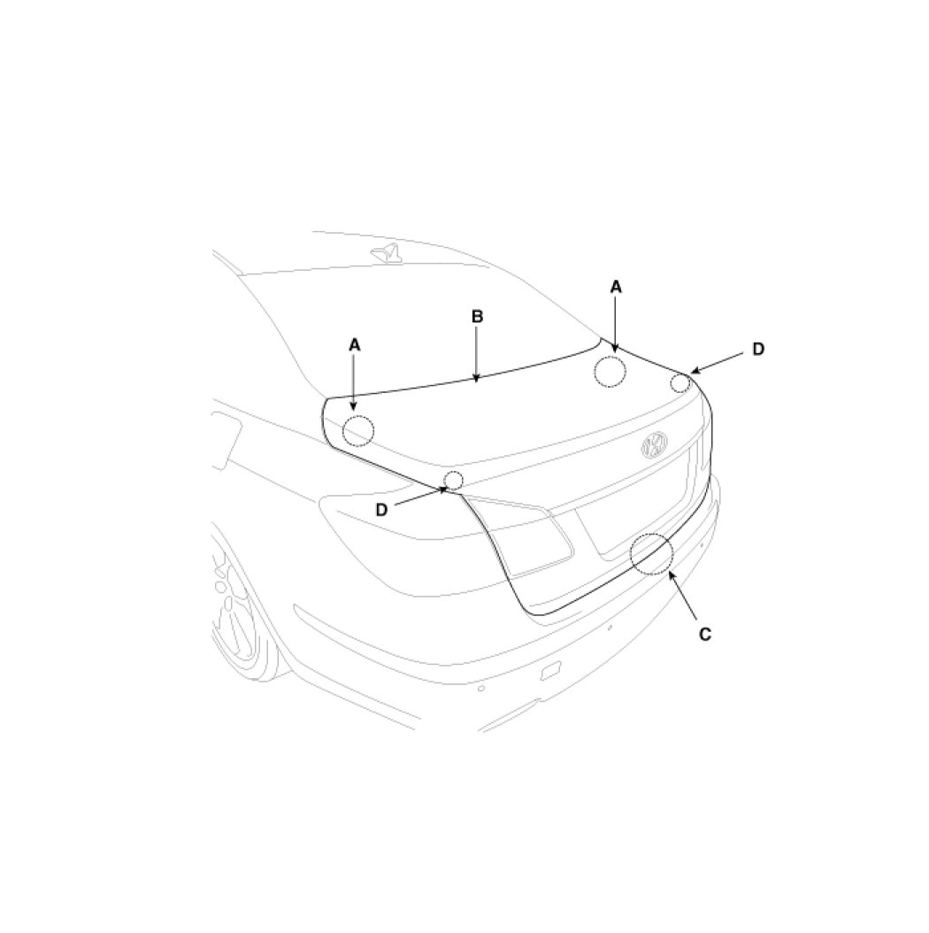 2. Adjust the trunk lid height by turning the trunk lid overslam bumpers (D).