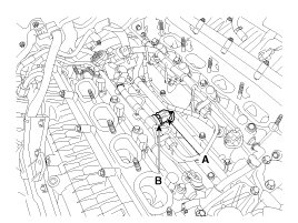 4. Disconnect the rail pressure sensor connector (A), and then remove the sensor (B) from the delivery pipe.
