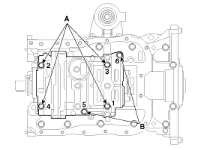 (1) Tighten the bolts in order number as shown with seating torque 26.4 N.m (3.0kgf.m, 21.7 lb-ft) and then loosen the bolts as reverse tightening order. (6-5-4-3-2-1).