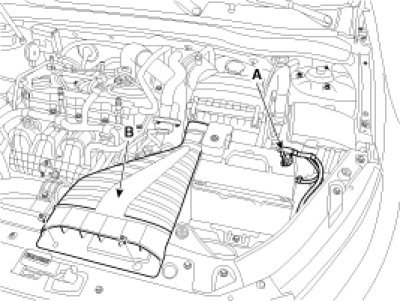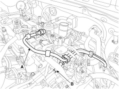 25. Connect the fuel hose (A) and PCSV (Purge control solenoid valve) hose (B).