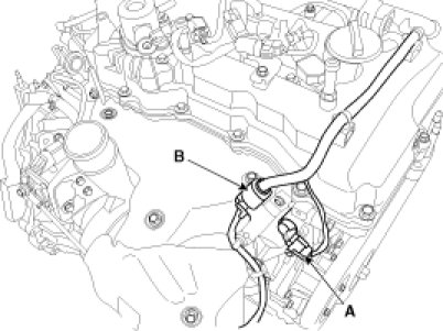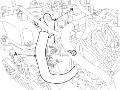 21. Install the front engine hanger (B) and then connect the PCV (Positive crankcase ventilation) hose (A).
