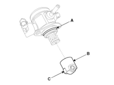 Apply engine oil to the O-ring (A) of the high pressure fuel pump, the roller tappet (B), and the protrusion (C). Also apply engine oil to the groove where the protrusion is installed.