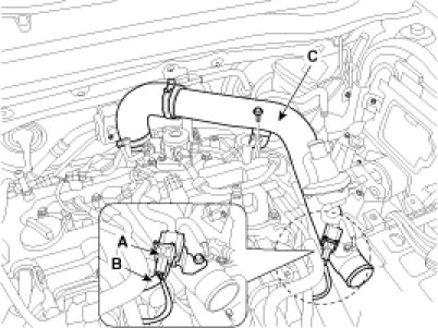 30. Install the intercooler inlet pipe & hose assembly (C) and then connect the recirculation valve connector (A) and the vacuum hose (B).