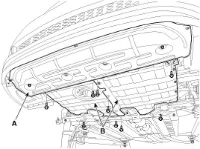 14. Install the engine mounting support bracket (B) and connect the ground line (A).