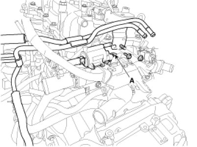 24. Connect PCSV (Purge control solenoid valve) connector (A) and tighten the vacuum pipe assembly mounting bolts and nut.