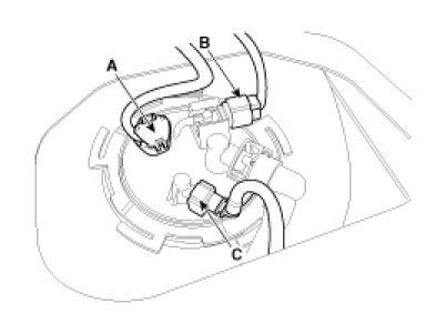 3. Disconnect the fuel pump connector (A) and the fuel tank pressure sensor connector (B).