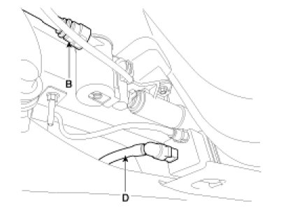 7. Disconnect the fuel filler hose (A), the ventilation tube quick-connector (B), and the vapor tube quick-connector (C,D).