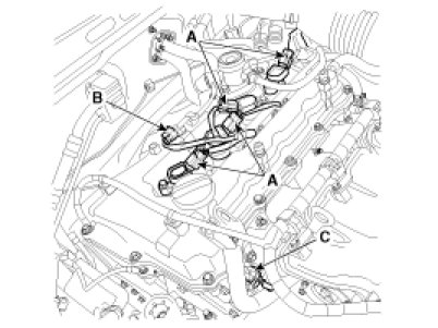 (3) Disconnect the ignition coil connectors (A), the fuel pump connector (B) and the intake OCV (Oil control valve) connector (C).